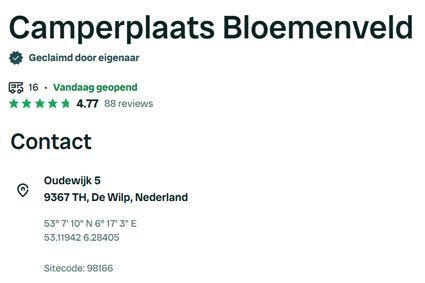 Sinds 1 mei 2021 is Camperplaats Bloemenveld geopend op een voormalige bloemenkwekerij in de Wilp (Groningen). Er zijn twaalf ruime plaatsen allen voorzien van een eigen stroompunt. De maximale camperlengte is 10 meter. Er is een sanitair unit met douche, toilet en wasplaats. Ook is er een leegpunt voor het chemisch toilet en een spoelplek. Water kan getapt worden achter bij de boerderij. Er is WIFI en honden zijn welkom!